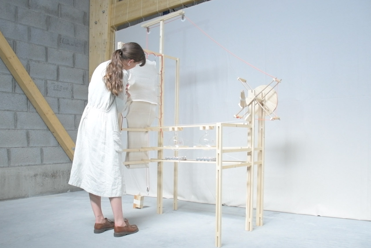 La défileuse est un dispositif de recyclage textile souverain et résilient. Cette machine performative permet de récupérer le fil de vêtements tricotés usagés tout en préservant l’intégrité de la fibre. Le designer est au centre du rituel régénératif, permettant de valoriser un matériau dans un cycle d'usage sensible et symbolique. L’acte collaboratif entre l’homme et son outil créatif résulte d’une chaîne d’opérations simples, permettant de démystifier le savoir-faire du recyclage et d’aborder la matière sensiblement. L’objet technique n’est plus une cadence dominante qui contraint la matière et le travailleur, mais permet d’appréhender la revalorisation de chaque vêtement dans leur singularité par l’usage, la généalogie, la symbolique.
